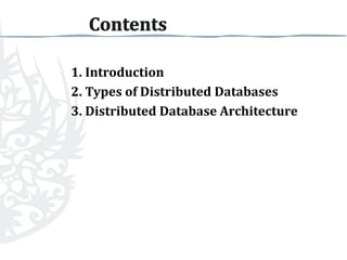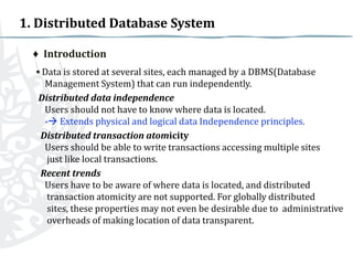 1. The document discusses types of distributed databases and distributed database architecture. It describes distributed databases as collections of shared data distributed over a computer network. Distributed databases can be either homogeneous, with all sites using the same DBMS, or heterogeneous, with different sites using different DBMSs. A distributed DBMS manages the distributed database and aims to make the distribution transparent to users.