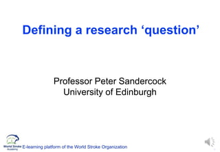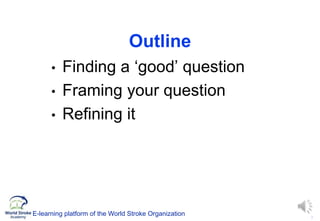 This document discusses defining a research question and provides guidance on framing a question. It explains that good questions come from various sources and outlines factors to consider, such as whether the question addresses an important problem, potential impact, and feasibility. The document also discusses framing questions using PICO elements and provides examples of refining questions for systematic reviews or trials based on inclusion criteria. Overall, it emphasizes the importance of taking time to properly define the research question.