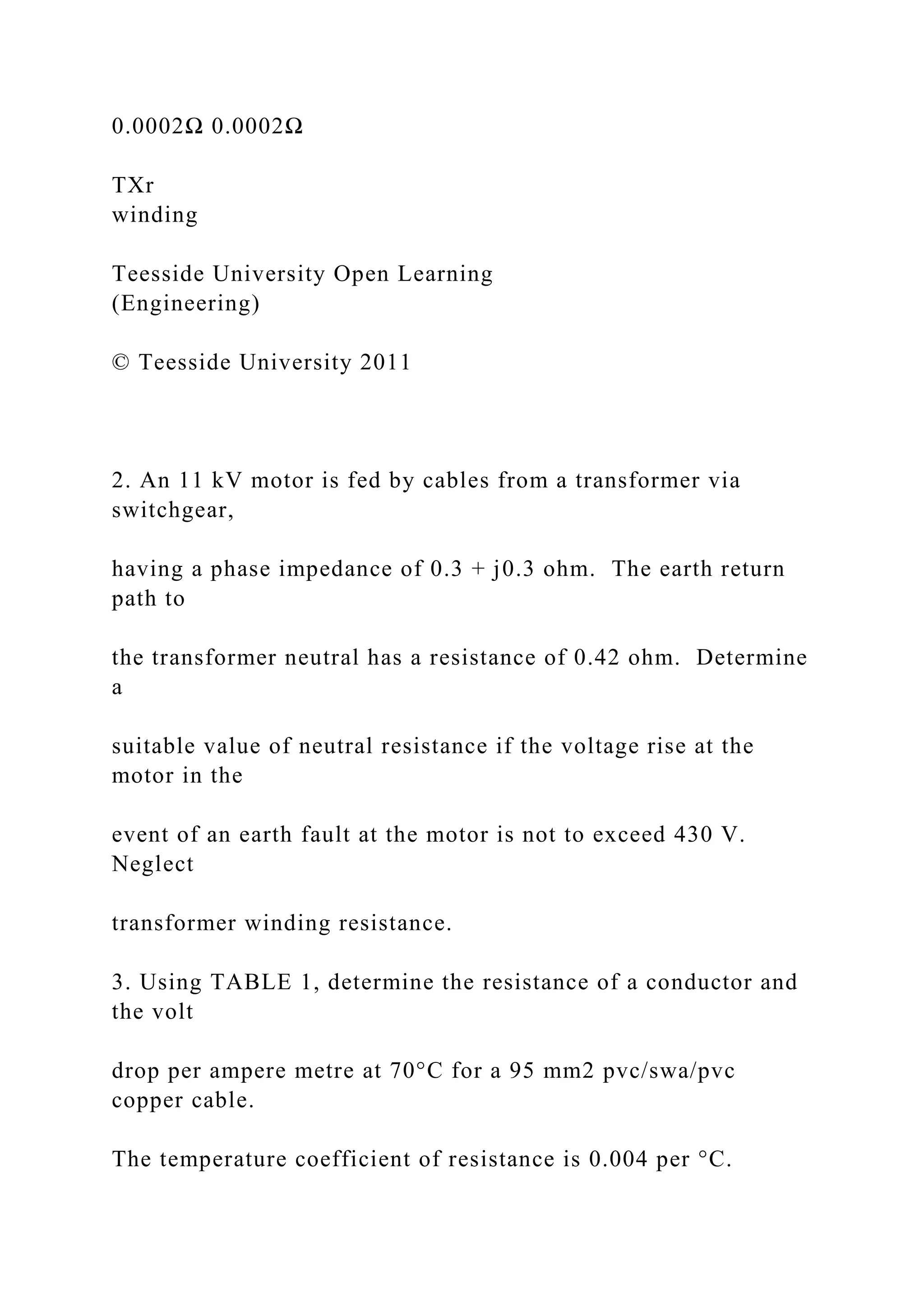 The document outlines various calculations and considerations related to electrical engineering, particularly focusing on voltage drops, fault currents, and relay settings in motor and power systems. It includes specific examples of determining the acceptable voltage rise at motors during faults, as well as the calculation of earth loop impedance and necessary fuse ratings. Additionally, it discusses protection systems, grading intervals, and the operation of differential relays in transformers.