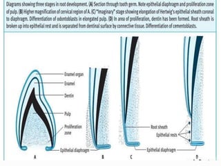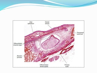 The document outlines the process of odontogenesis, detailing the stages of tooth development, including the bud, cap, and bell stages, as well as the roles of dental and vestibular laminae. It emphasizes the importance of understanding these developmental stages for diagnosing dental anomalies and describes the histophysiological changes that occur during tooth formation. Additionally, it provides a timeline of human tooth development and references key literature on the subject.