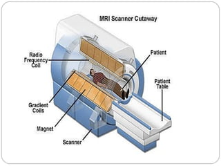 - Radiography provides static bone images but has limitations. CT and MRI produce cross-sectional "slices" and are better for soft tissue. CT uses ionizing radiation while MRI uses magnetic fields.