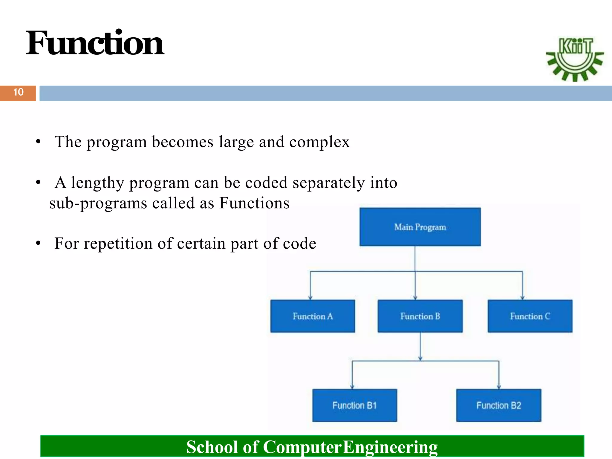 This document provides information about functions in C programming. It defines a function as a block of code that performs a specific task and can be reused. The general form of a function definition includes the return type, function name, parameters, and function body. Functions allow breaking a large, complex program into smaller, modular sub-programs. Parameters are used to pass values between the calling function and the called function. Variables have local scope and are only accessible within the function they are defined, so parameters must be explicitly passed between functions. Functions can return values to the calling function using the return statement.