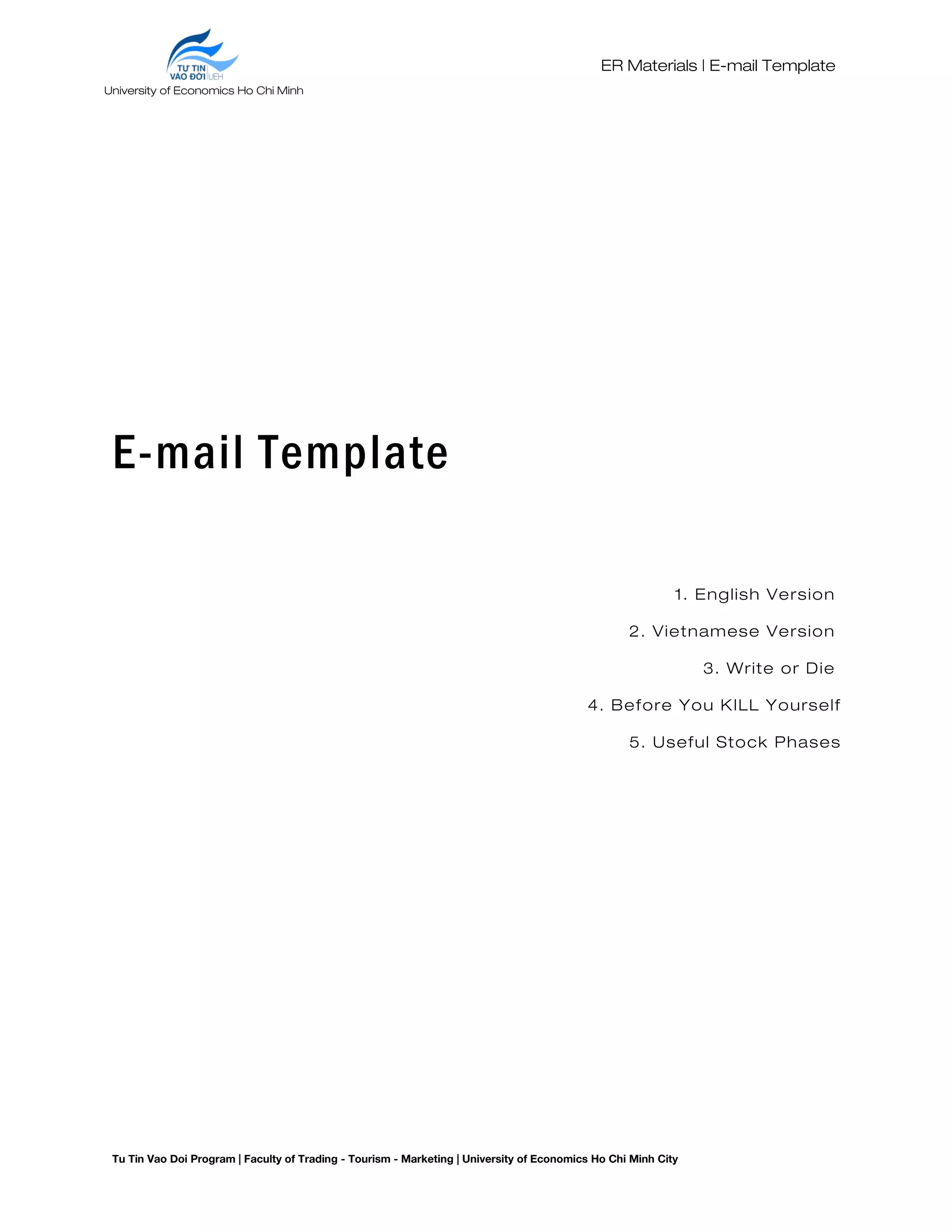 The document contains an email template in English and Vietnamese used by the Tu Tin Vao Doi Program at the University of Economics Ho Chi Minh City. The program aims to help senior students prepare for their careers. The email template is used to contact companies about partnership opportunities where companies can access local talent and increase their brand among university students. It provides information about the program and attaches a partnership package, then requests a meeting to discuss opportunities. Additional sections provide tips for writing effective emails, including checking details, setting clear appointments, and using stock phrases for different purposes.