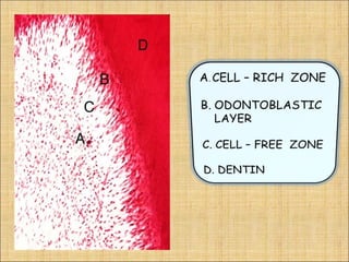 Enamel is the outermost covering of the tooth. It is the hardest tissue in the body and provides protection. It is made up of enamel rods arranged in a prism-like pattern. Dentin lies underneath the enamel and makes up the bulk of the tooth. It contains dentinal tubules that house odontoblast processes. The innermost living tissue is the pulp, which contains blood vessels, nerves, and odontoblasts.
