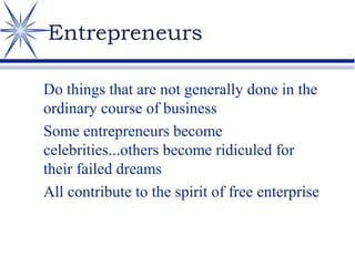 Entrepreneurship refers to the process of starting a business or new venture that involves risk-taking and innovation. An entrepreneur is someone who combines resources to create value by providing goods or services. Successful entrepreneurs possess traits like self-confidence, risk-taking ability, leadership skills, and the ability to identify opportunities. Entrepreneurship contributes to economic development by increasing productivity, income, and stimulating investment through new business ventures and innovations.
