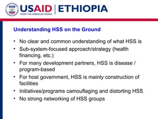 The document discusses health systems strengthening (HSS) programs and approaches in Ethiopia. There is no clear or common understanding of what HSS entails. It can be viewed as focused on health subsystems, diseases, or construction of facilities. The key HSS building blocks experienced in Ethiopia include health financing, workforce, information systems, supply management, and governance. Financing for HSS comes from various global and bilateral partners as well as the Ethiopian government. Recommendations include focusing on the big picture of comprehensive HSS, establishing networking, and promoting harmonization of the HSS concept.