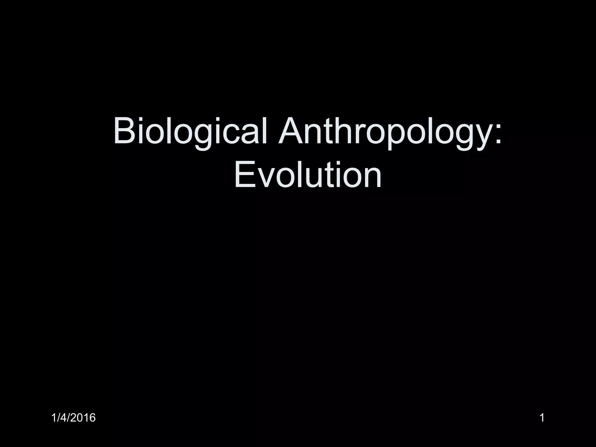 This document provides an overview of biological anthropology and evolution. It defines biological anthropology as the study of humans from a biological perspective using a scientific framework. It states that evolution is defined as genetic changes within populations over time, and is considered a fact as it has been repeatedly observed, for example with MRSA bacteria and Archaeopteryx fossils. The document goes on to explain that evolutionary theory refers to scientific explanations for the fact of evolution, the most well-known being Charles Darwin's theory of natural selection which proposed that organisms with traits adapted for their environment are more likely to survive and reproduce.