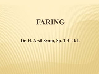 Dokumen ini menyajikan informasi tentang anatomi dan fisiologi faring, termasuk pembagian faring menjadi nasofaring, orofaring, dan laringofaring. Selain itu, dijelaskan juga mengenai vaskularisasi, persarafan, dan fungsi organ limfoid pada faring yang membentuk 'cincin waldeyer'. Buku rujukan ini berisi sumber-sumber terkait tentang penyakit THT dan teknik pemeriksaan THT.