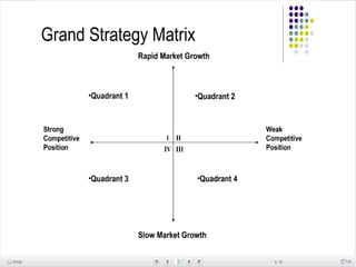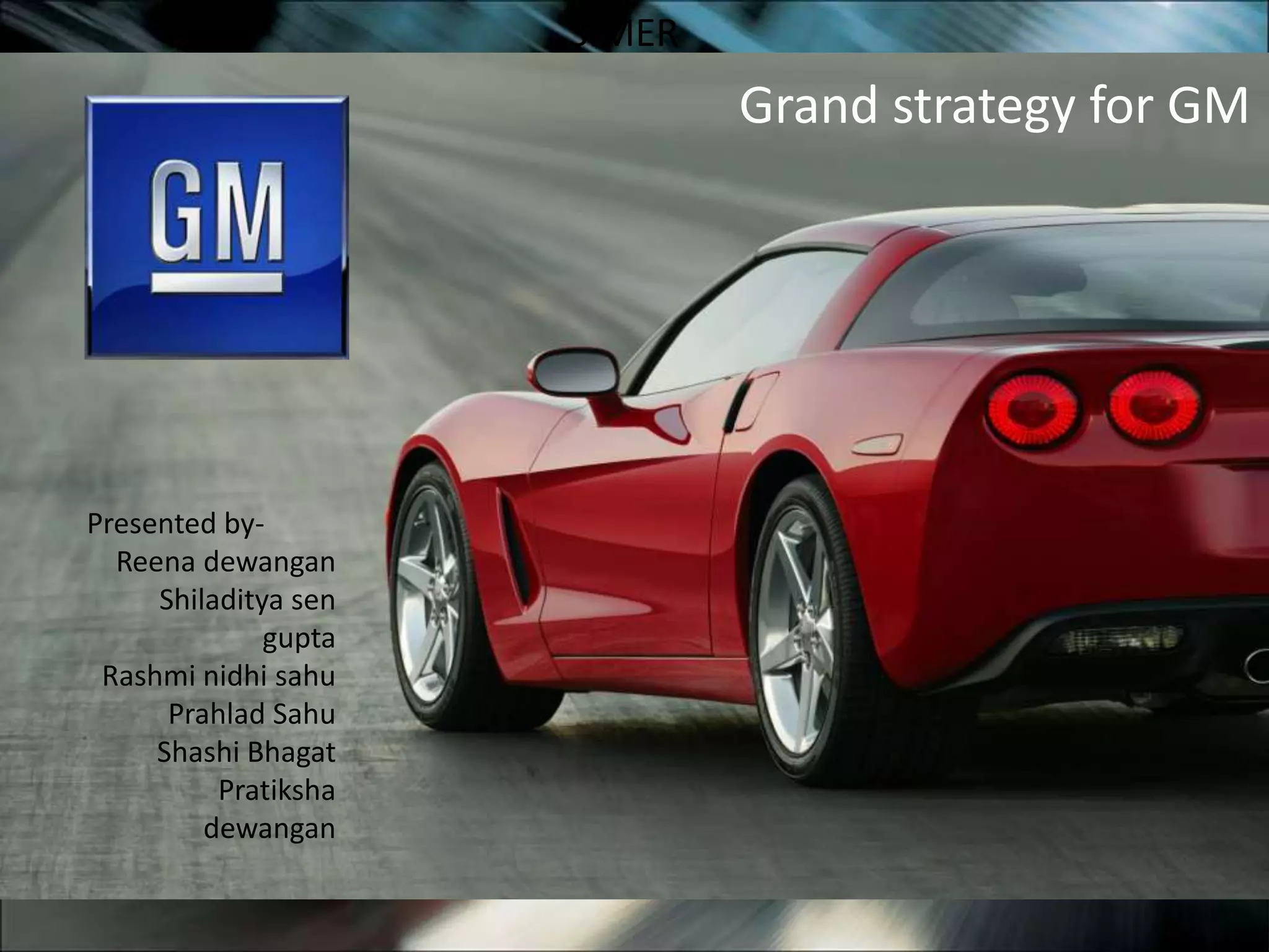 General Motors presented a grand strategy for the company that included four main alternatives: stability, growth, combination, and retrenchment. The strategies were mapped based on market growth and competitive position. Growth strategies included market penetration, market development, product development, and integration approaches like backward, forward, and horizontal integration. Diversification could be concentric, horizontal, or conglomerate. The presentation analyzed GM India's product lineup, branding, and proposed a three pillar marketing strategy focusing on integration, partnerships and sustaining efforts.