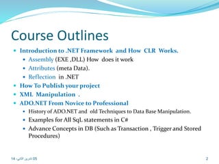 الوثيقة تتناول تفاصيل دورات تعليمية حول تطوير البرمجيات باستخدام .NET Framework، بما في ذلك مفهوم CLR، إدارة الذاكرة، البرمجة المتعددة الخيوط، وتقنيات الأمان. تشمل أيضًا أمثلة عملية في التعامل مع قواعد البيانات، برمجة الشبكات، والبرمجة المتزامنة، إلى جانب فهم كيفية إنشاء وتوزيع المكونات. يقدم المشروع النهائي للدورة تجربة عملية في إدارة الموارد وبرمجة العملاء في بيئة آمنة.