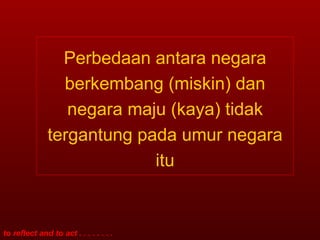 Dokumen ini membahas perbedaan antara negara maju dan berkembang, menegaskan bahwa faktor utama tidak terletak pada sumber daya alam atau umur negara, tetapi pada sikap dan perilaku masyarakat. Ditekankan pentingnya etika, tanggung jawab, dan disiplin dalam kehidupan sehari-hari untuk memperbaiki keadaan ekonomi suatu negara. Akhirnya, penulis mengajak pembaca untuk merefleksikan dan memulai perubahan dari diri sendiri untuk kemajuan negara.