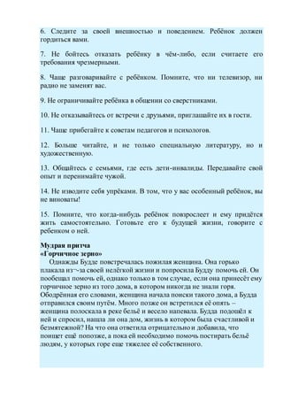 Документ обсуждает важность семейного воспитания для гармоничного развития детей, особенно для детей с ограниченными возможностями. Он подчеркивает необходимость создания поддерживающей и любящей атмосферы в семье и предлагает советы для родителей, как обеспечить стабильное психологическое окружение. В завершение приводится притча о горчичном зерне, иллюстрирующая тот факт, что страдания и трудности бывают у всех.