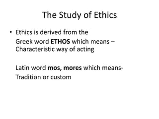 Ethics is the study of morality and human conduct. There are several branches of ethics including meta-ethics, normative ethics, applied ethics, descriptive ethics, and moral psychology. Meta-ethics examines the meaning of moral concepts. Normative ethics determines moral standards. Applied ethics applies moral principles to specific situations. Descriptive ethics studies people's actual moral beliefs. Moral psychology examines moral development and capacity. Principles of ethics include personal ethics concerning well-being and respect of others, global ethics of justice and environmental stewardship, and professional ethics of honesty, integrity, and accountability. Ethical principles serve as guidelines but may conflict in practice, requiring weighing of circumstances.