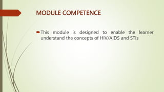 The document provides an educational overview of HIV/AIDS and STIs, aimed at enabling learners to define key terms, understand prevention and management strategies, and appreciate the impact of the disease on various populations. It outlines the historical background, prevalence statistics in Kenya, modes of transmission, and the effects of HIV on the immune system. The document also discusses the socio-cultural, biological, and behavioral factors contributing to the HIV epidemic and emphasizes the need for effective communication and community-based care.