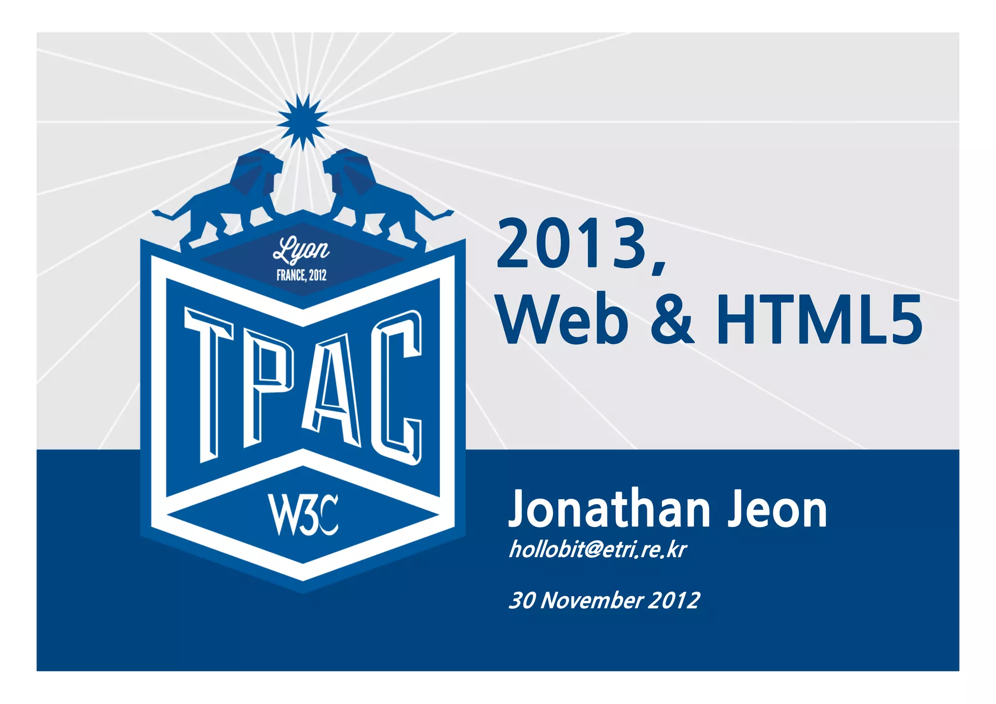 The document discusses predictions for trends in web and HTML5 for 2013. The top 10 trends are: 1) Increased use of HTML5-enabled devices, 2) HTML5 becoming the standard, 3) Plans to finalize HTML5.1 in 2014, 4) Specialization of web apps, 5) Increased web APIs, 6) Emergence of web operating systems, 7) Expansion of the web into new areas, 8) Responsive web design, 9) Need for policies around the web, and 10) Rethinking the web ecosystem. The document provides details on each trend and discusses related topics like HTML5 standardization.