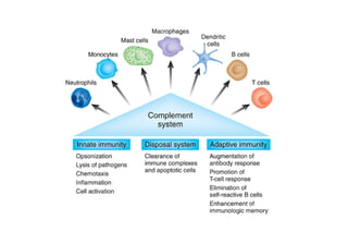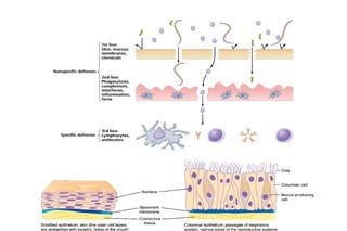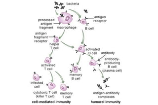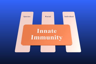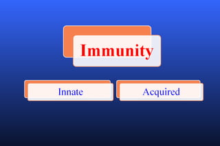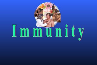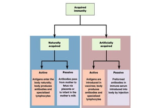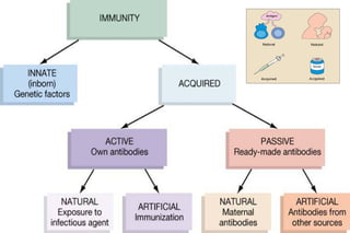 The document discusses various topics related to immunology including innate immunity, acquired immunity, active immunity, passive immunity, factors influencing innate immunity, a comparison of active and passive immunity, the mechanisms of innate immunity, local immunity, herd immunity, adoptive immunity, vaccines, cell-mediated immunity, and antibody-mediated immunity. It also briefly mentions severe combined immunodeficiency disorder, otherwise known as "bubble boy disease".