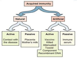 The document defines key terms related to the immune system and its components. It describes the immune system as the body's defense against foreign invaders like bacteria, viruses, and fungi. The immune system includes white blood cells, organs like the bone marrow, lymph nodes, tonsils, thymus, and spleen. When pathogens enter the body, the immune system responds through nonspecific defenses like barriers, inflammation, and phagocytosis by white blood cells. It also has specific defenses like antibodies and lymphocytes that provide long-lasting protection against specific pathogens.
