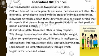 The document also discusses factors that influence individual differences, such as heredity, environment, and psychological factors. It explains the complementary roles of heredity and environment in shaping a person's growth and development. Additionally, the concepts of personality, personality traits, and theories of personality like trait theory are introduced. Specifically, theories by Gordon Allport, Raymond Cattell, and the Big Five model of personality traits are summarized.