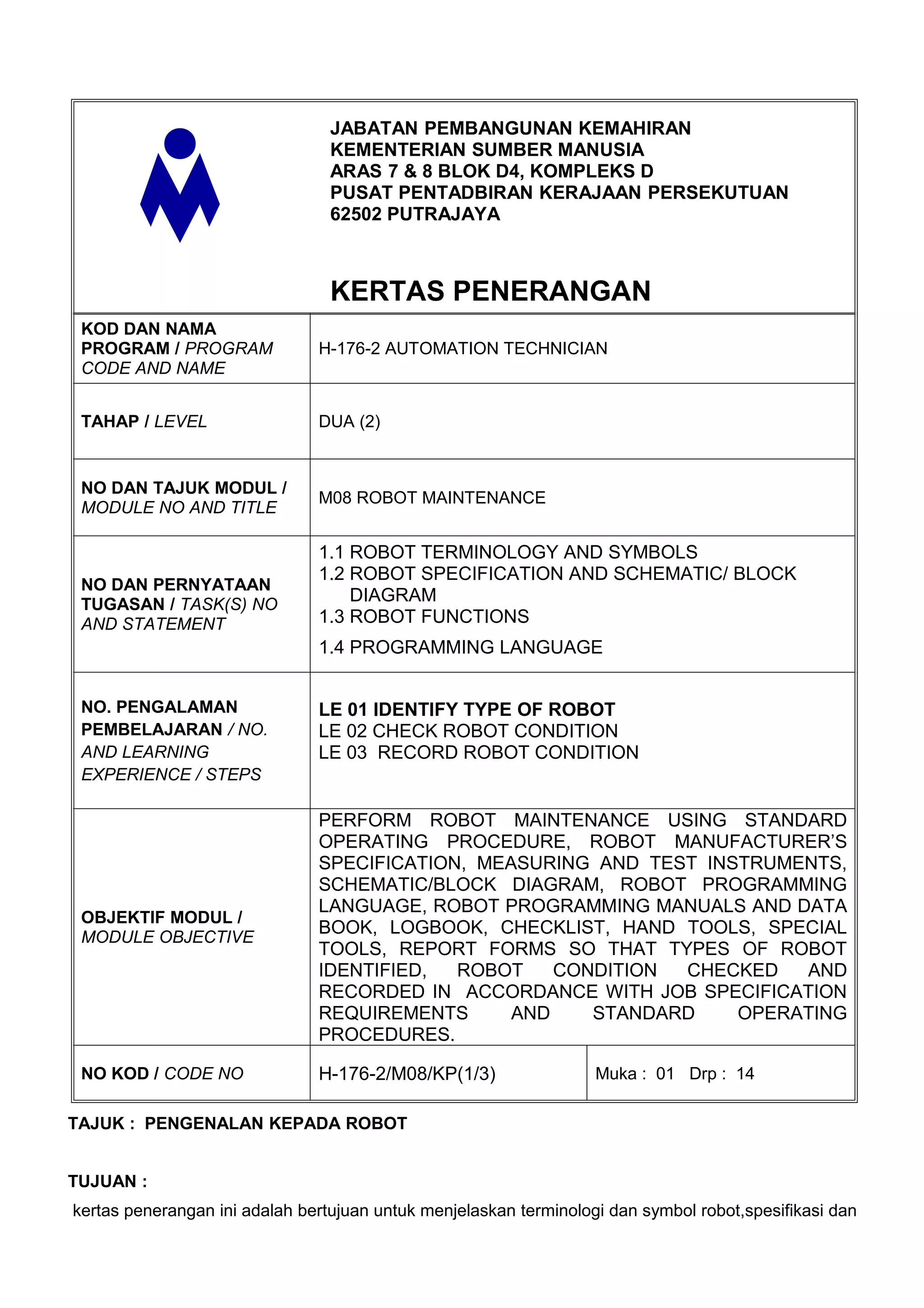 Dokumen tersebut memberikan penjelasan tentang terminologi dan simbol robot, spesifikasi dan skematik robot, serta fungsi robot dan bahasa pengaturcaraan robot dalam 3 kalimat. Dokumen tersebut juga menjelaskan undang-undang robot menurut Isaac Asimov yaitu robot tidak boleh mencederakan manusia atau bertentangan dengan undang-undang.