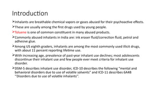 Commonly abused inhalants in India are: ink eraser fluid/correction fluid, petrol and