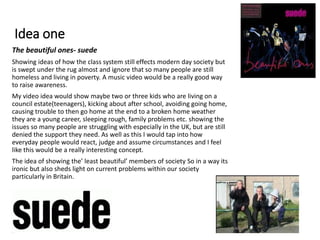 The document outlines three initial music video ideas for different songs, describing scenarios, themes, and visual concepts. Strengths and weaknesses are considered for each idea. Additionally, research targets are identified for finalizing a video concept focusing on the Oasis song "Songbird," including suitable locations, filming techniques, and camera equipment.