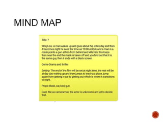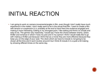 The document outlines initial plans for a student film project, including choosing the thriller genre to keep audiences engaged. It discusses using camera movements to create tension and focusing on editing skills. It proposes including a clock as a prop but not making it central. Locations on campus will be scouted to film someone going through their day, with night scenes shot in a nearby alley requiring a mask, gun and car props already owned. Fast forwarding will create a time-lapse loop. Only one character is needed so casting should be easy.
