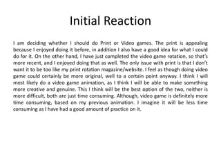 The document discusses the author's initial plans for their final project, considering whether to do print or a video game. While print was appealing due to past experience, the author enjoyed their recent video game rotation and feels a video game animation could be more original. They decide a video game animation is the best option, as it will allow them to create something more creative and genuine, though it will be more time consuming than print.