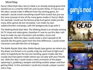 The document discusses three potential ideas for a game animation project: a Garry's Mod style idea recreating the prop hunt game mode, a The Walking Dead style idea creating original characters and zombies for a short episode, and a Battle Royale style idea animating a player spawning, grabbing a weapon, killing another player, and getting killed with a player counter and map. The document then details choosing to do a Battle Royale animation because those games are very popular, and plans to create all original assets like characters, weapons, backgrounds, and death animations.