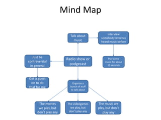 Ryan plans to start a radio show or podcast where he will talk about and play short clips of music. He will interview guests about their musical tastes and opinions. Some topics he plans to discuss are popular music, video games, movies, and being intentionally controversial to generate discussion. He also considers having a guest host who can discuss controversial topics so he does not have to.