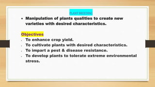 The document outlines various plant breeding methods, including inbreeding, hybrid breeding, backcrossing, mutation breeding, and genetic engineering, aimed at enhancing crop yield and resistance to pests and environmental stress. It highlights significant contributions from scientists in the field, such as Gregor Mendel and Norman Borlaug, and key innovations in plant breeding techniques throughout history. Additionally, it discusses concepts like gene pools and resistance mechanisms that are important in breeding practices.