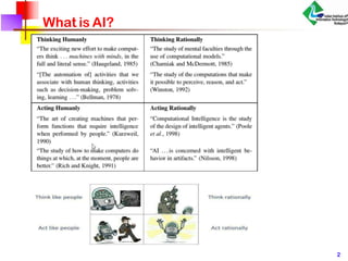 The document provides a comprehensive introduction to artificial intelligence (AI), covering foundational concepts such as the Turing Test, rational agents, and various philosophical and scientific underpinnings. It outlines the historical development of AI, from early neural models and symbolic systems to contemporary applications in robotics, speech recognition, and machine learning. Lastly, the document highlights the challenges and critiques faced by the field, alongside the evolution of AI technologies over the decades.
