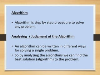 The document provides an analysis of the insertion sort algorithm, which sorts an array by repeatedly picking the next element and inserting it into the correct position within the sorted portion of the array. The algorithm iterates through each element, comparing and shifting elements as necessary until the whole array is sorted. Its efficiency and step-by-step mechanics are highlighted in the provided code implementation.