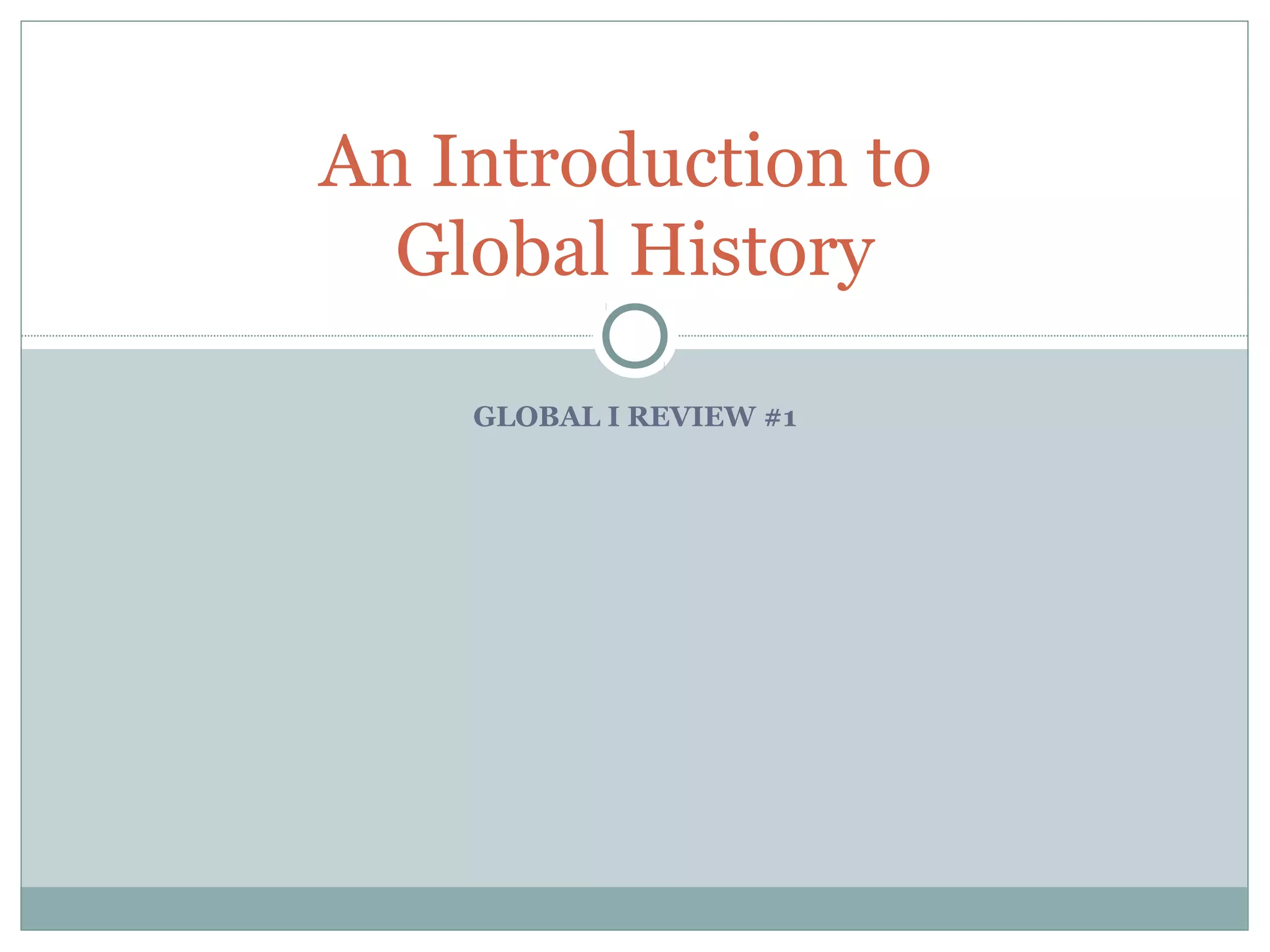 This document provides an introduction to global history. It discusses primary and secondary sources that historians use to understand the past. It also outlines different social scientists like economists, geographers, archaeologists, and anthropologists and how they study and interpret history. The document defines different types of maps, what culture is, and the differences between cultural isolation and cultural diffusion. A major turning point in history discussed is the Neolithic Revolution and domestication of plants and animals, which led to permanent settlements and early civilizations along river valleys like Mesopotamia, Indus Valley, Yellow River Valley, and Nile River Valley.