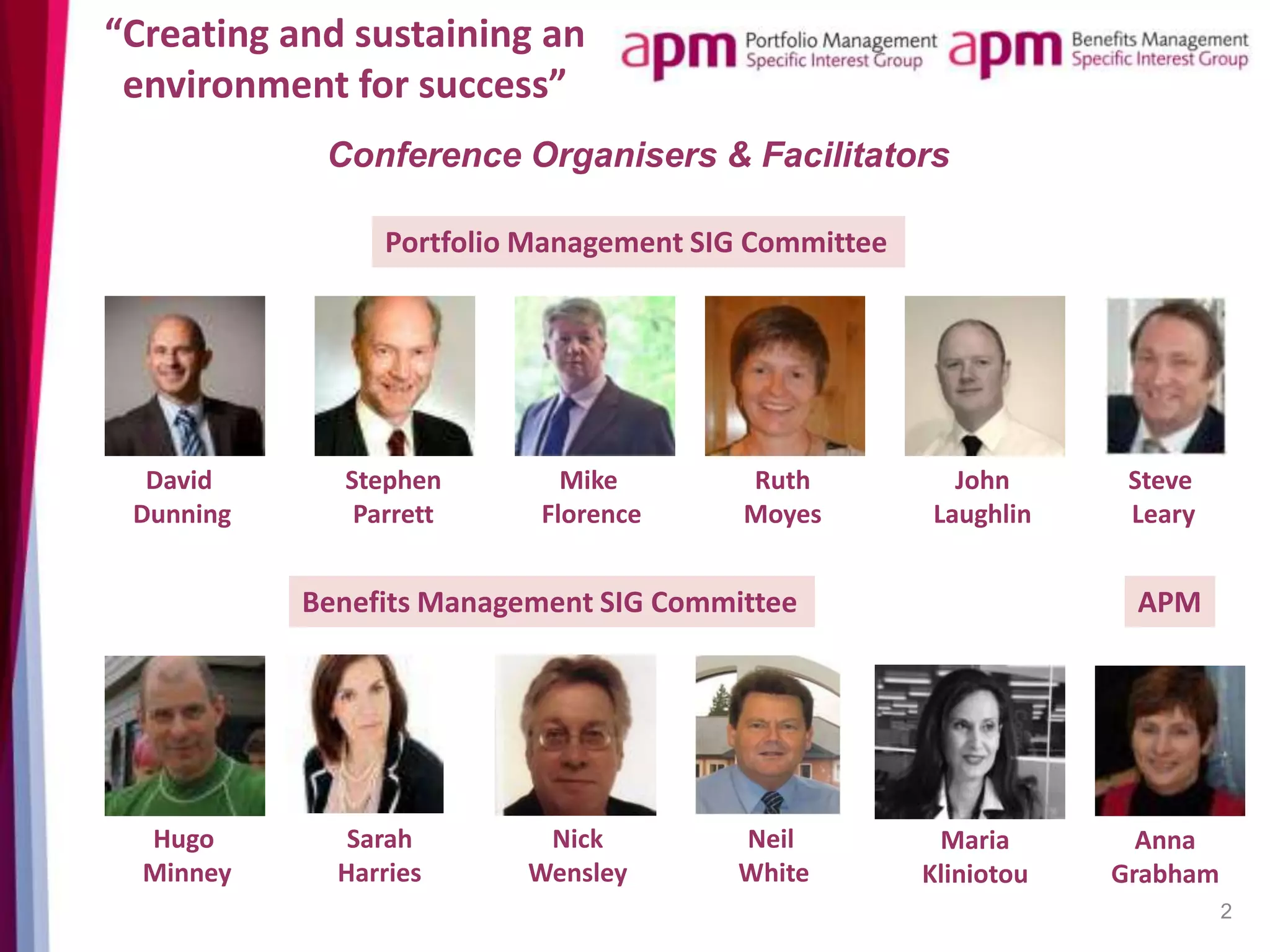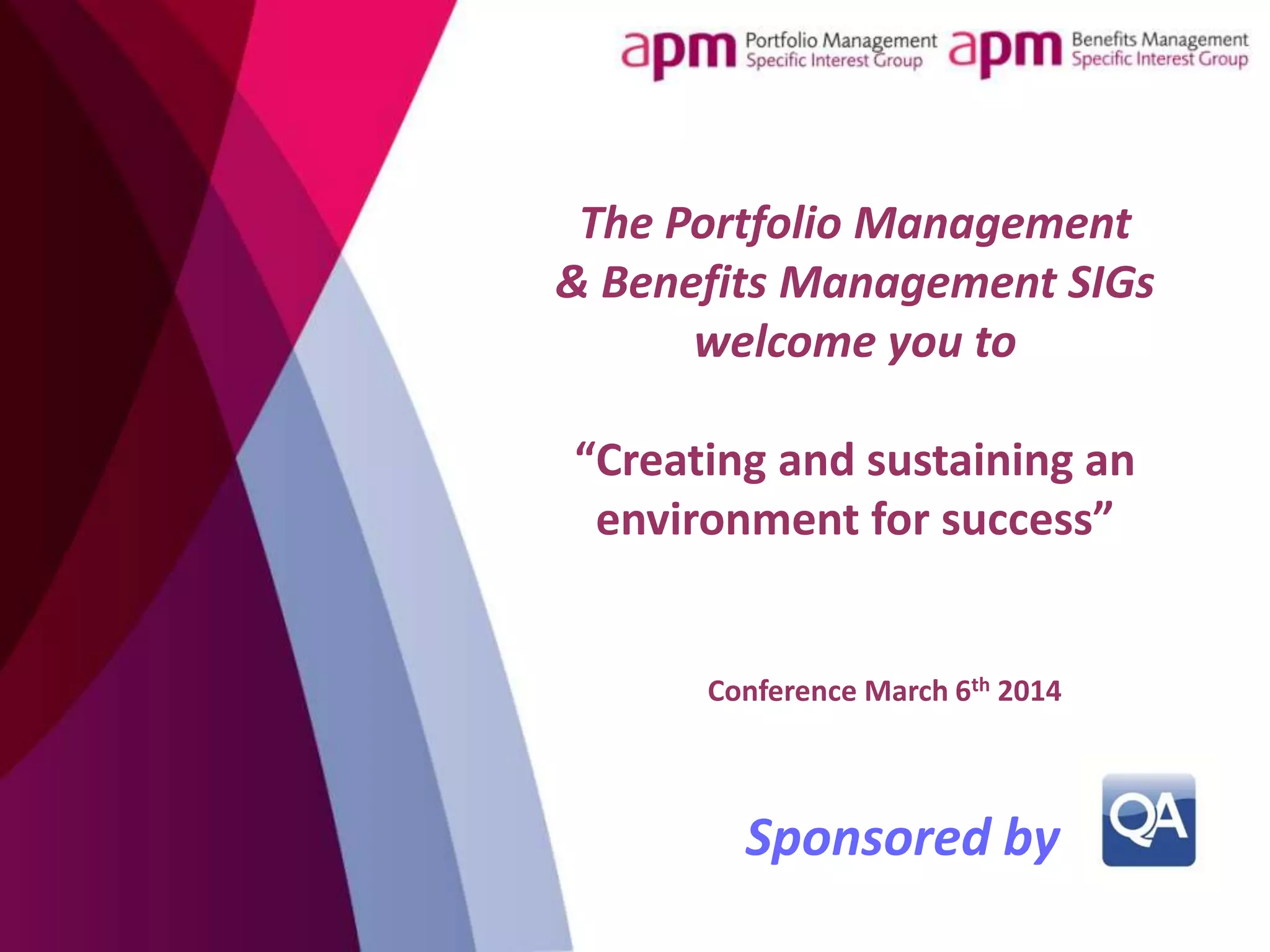 The document summarizes a conference on "Creating and sustaining an environment for success" related to portfolio management and benefits management. The one-day conference included presentations from various organizations on their experiences implementing portfolio and benefits management. It also included workshops for attendees to discuss challenges and solutions. The conference aimed to share knowledge among practitioners and support the development of the field.