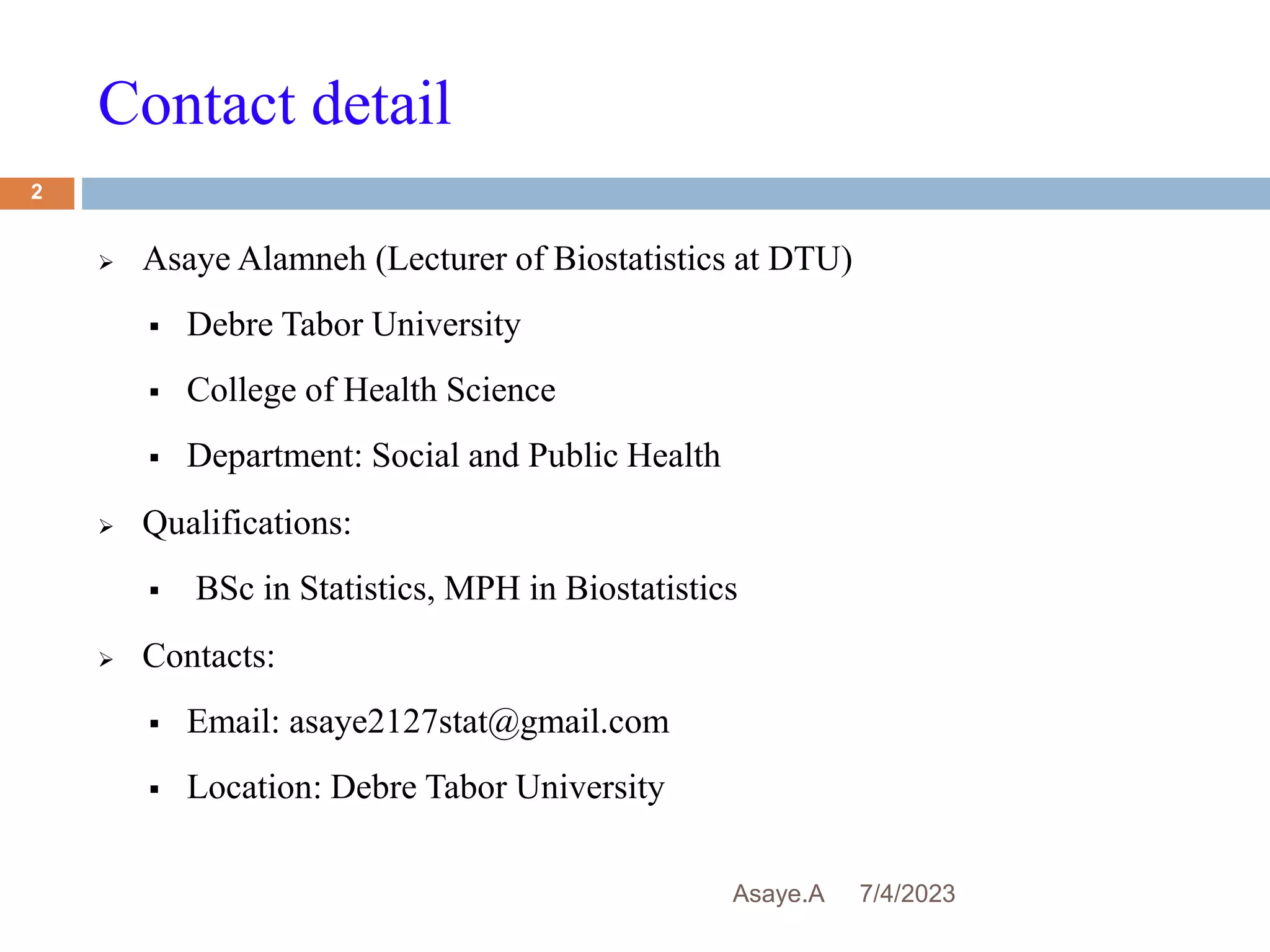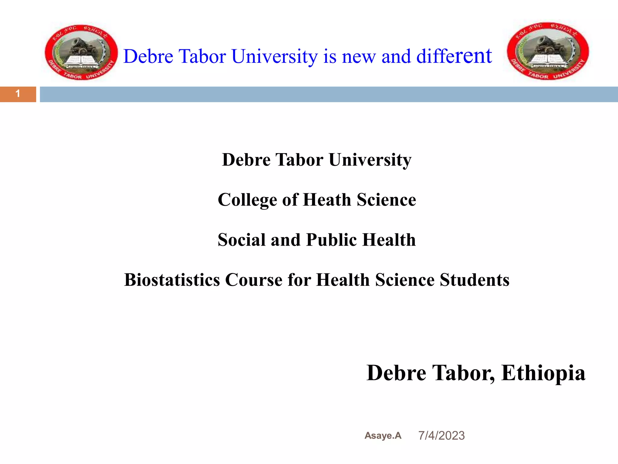 This document provides an introduction to biostatistics for health science students at Debre Tabor University in Ethiopia. It defines biostatistics as the application of statistical methods to medical and public health problems. The introduction outlines topics that will be covered, including defining key statistical concepts, classifying variables, and discussing the importance and limitations of biostatistics. Contact information is provided for the lecturer, Asaye Alamneh.