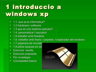 1 introduccio awindows xp 1.1. que es la informatica? 1.2 hardware i software 1.3.que es una sistema operatiu? 1.4. personalitzar l`escriptori 1.5.treballar amb finestres 1.6. treballar amb fixers i carpetes. l`explorador del windows 1.7.paperera de reciclatge 1.8.altres tasques en windows Exercicis resolts Exercicis proposats Per investegar Conceptates basics