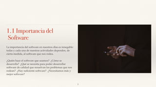 This document provides an introduction to software engineering. It discusses the importance of software today and how it has evolved significantly since the Apollo 11 moon landing. Some key characteristics of good software discussed include maintainability, correctness, reusability, reliability, and portability. The document also examines the software crisis and reasons it occurred, such as requirements constantly changing and not enough developers. Different paradigms for software development are presented, including waterfall model and agile development. Finally, the document introduces computer-aided software engineering (CASE) tools and how they can benefit the software development process.