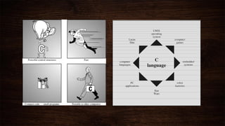 This document provides an overview of the C programming language course contents which includes data types, operators, control statements, functions, arrays, pointers, input/output and string functions. It also discusses the seven steps of programming, C strengths such as efficiency and portability, weaknesses like not being object-oriented, and provides simple C program examples and explanations.