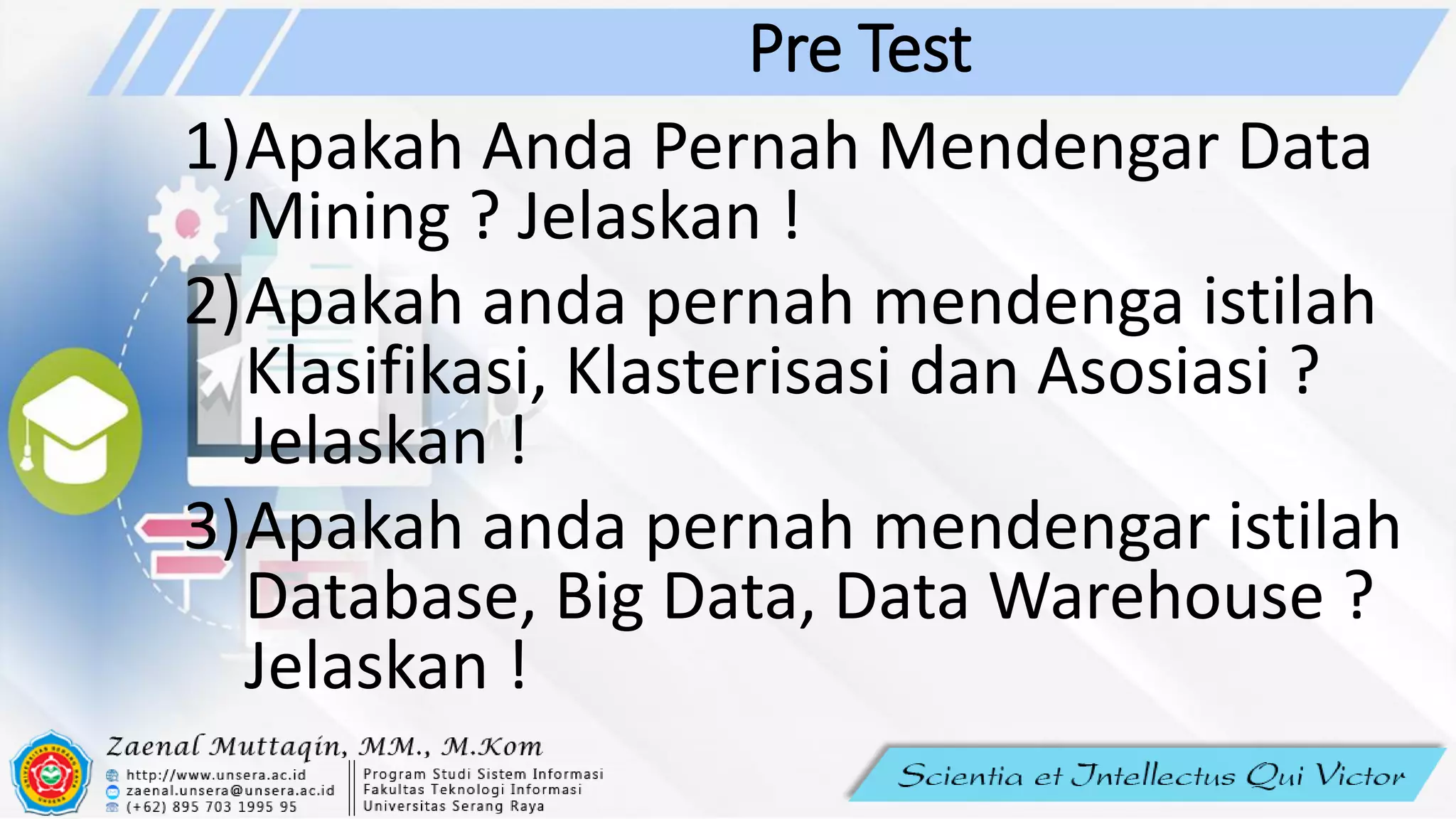 Dokumen ini berisi rencana silabus mata kuliah Data Mining. Mata kuliah ini membahas konsep, metode, dan teknik dasar data mining seperti klasifikasi, klasterisasi, asosiasi, dan prediksi. Tujuan utamanya adalah memastikan mahasiswa memahami sejarah dan dasar ilmu data mining serta mampu mendeskripsikan dan mendemonstrasikan konsep, metode, dan tekniknya. Evaluasi dan penilaian mata kuliah ini terdiri atas tugas,