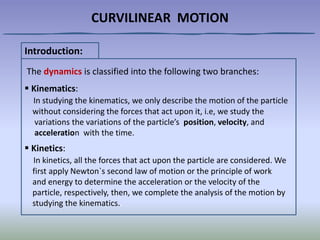This document discusses curvilinear motion and its kinematics. It defines curvilinear motion as the motion of a particle along a curved path and introduces the key concepts in analyzing this motion, including position vector, path, velocity, acceleration, and rectangular components. The document also distinguishes between kinematics, which describes motion without considering forces, and kinetics, which takes forces into account to determine acceleration or velocity.
