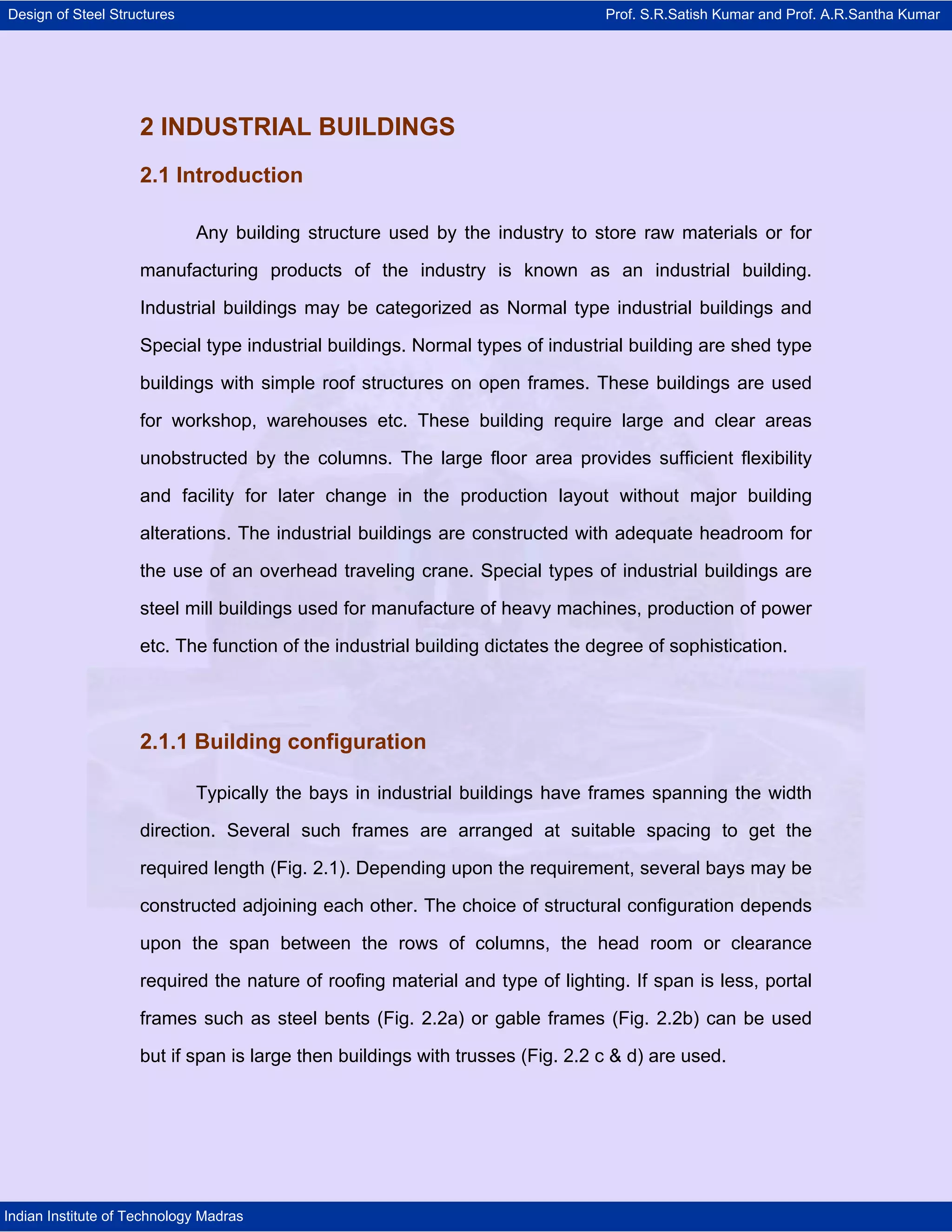 This document discusses the design of steel structures for industrial buildings. It describes industrial buildings as structures used for storage, manufacturing, or workshops. Normal industrial buildings are simple shed structures with open frames, while special buildings are more sophisticated steel mills or power plants. The document outlines various structural configurations used for industrial buildings, including portal frames, gable frames, and trusses to span different bay widths and heights. It also discusses considerations for industrial building floors, roofs, lighting, and ventilation.