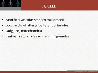 The document summarizes tubuloglomerular feedback and the juxtaglomerular complex. It describes two feedback mechanisms involving the afferent and efferent arterioles that depend on the juxtaglomerular complex near each nephron's glomeruli. The juxtaglomerular complex includes macula densa cells in the distal tubule and juxtaglomerular cells in the walls of the arterioles that synthesize and release renin in response to salt levels. Lacis cells also help regulate vasoconstriction and vasodilation of the renal arterioles and modify signals from the macula densa cells.