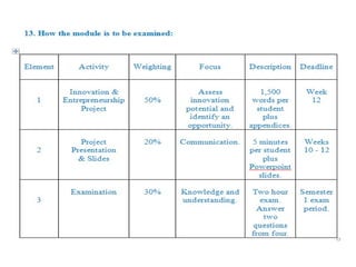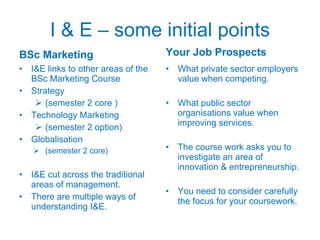 This document provides an introduction to a course on Innovation and Entrepreneurship (I&E). It discusses how I&E relates to other business areas and notes that the coursework will ask students to investigate an area of I&E and identify opportunities. It also highlights the importance of I&E to the economy and job prospects, citing views from industry reports, government ministers, and universities on growing sectors and driving innovation. The document provides an overview of perspectives on I&E and notes resources on the topics from various organizations.