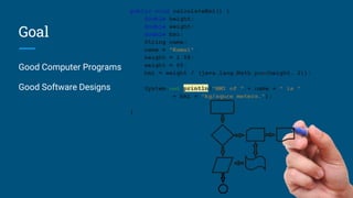 This document provides an overview of mathematics for computing and object oriented programming. It discusses the goals of good computer programs and software designs. It then covers key aspects of programming like characteristics of good programs, the software development process, software design, and object oriented programming concepts. Finally, it lists important links and resources for further learning.
