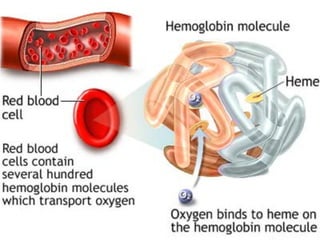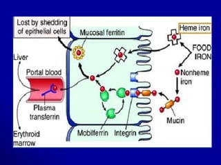 This document discusses blood formation and types of anemia. It explains that blood is composed of red cells, white cells, platelets, and plasma. Blood formation begins in the yolk sac in the 2nd week and later occurs chiefly in the liver and spleen, then the bone marrow. The bone marrow contains stem cells that can differentiate into mature blood cells. Various growth factors are involved in blood formation. The document also classifies and describes different types of anemia, including iron deficiency anemia, and lists causes and treatment for anemia.