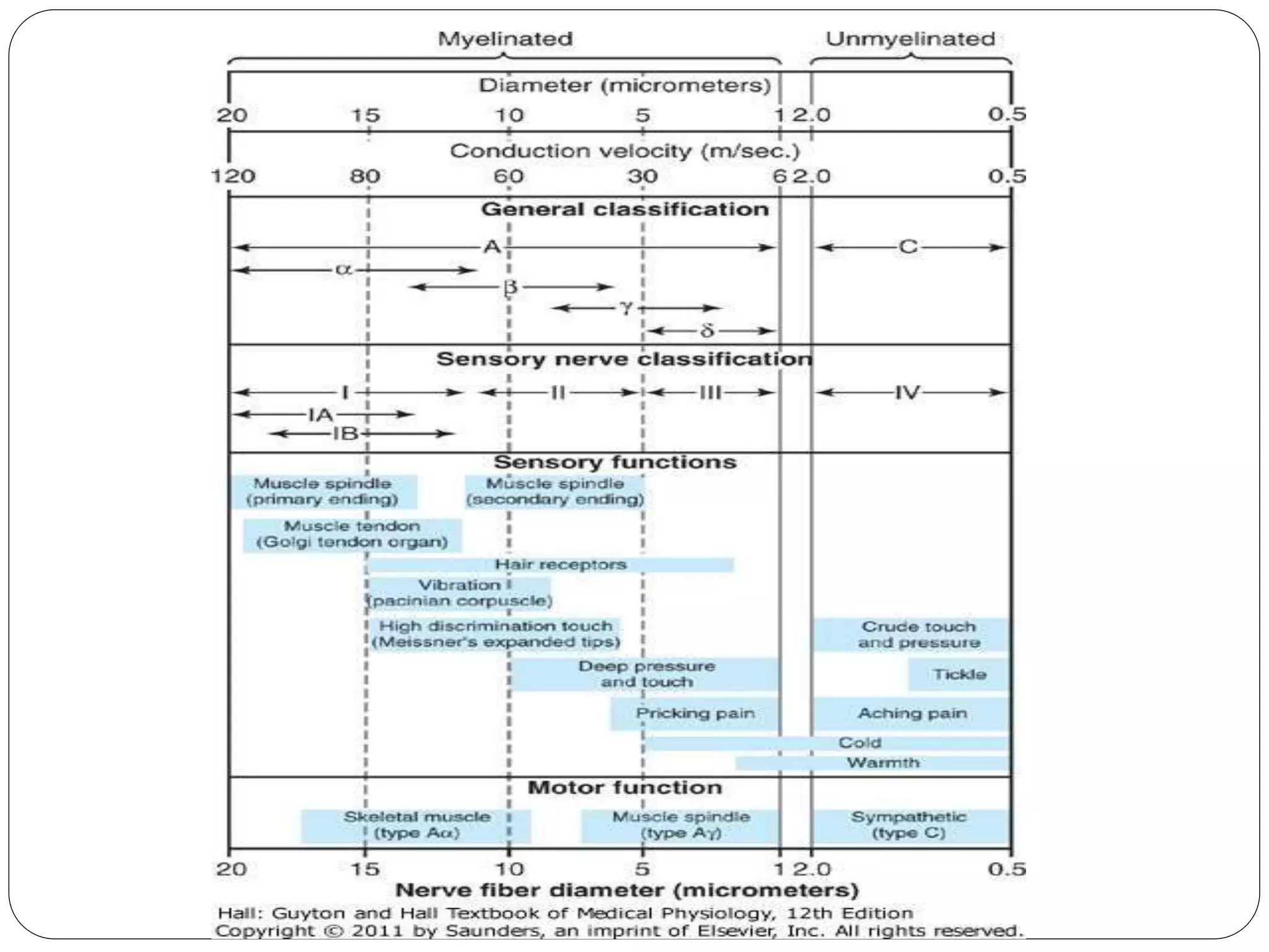 - Erlanger and Gasser classification (Aα, Aβ, Aγ, Aδ, B, C, etc.) based on diameter and conduction velocity.