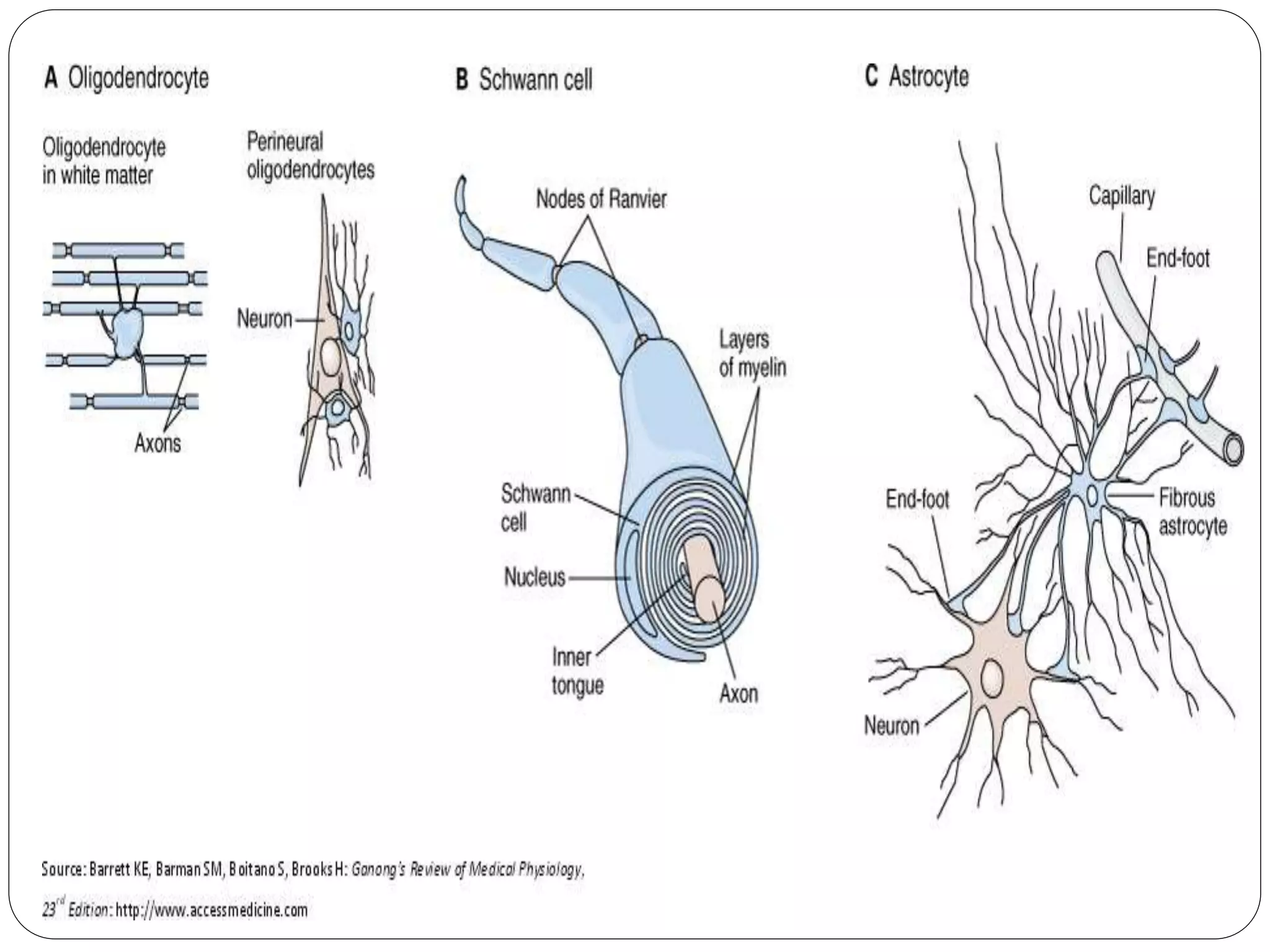 1. Glial cells are the connective tissue of the CNS. There are three main types of glial cells: astrocytes, oligodendrocytes, and microglia. Astrocytes help form the blood-brain barrier and provide nutrients. Oligodendrocytes create myelin sheaths around axons. Microglia are immune cells that remove cellular debris.