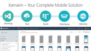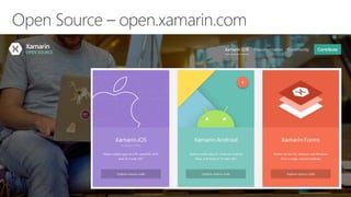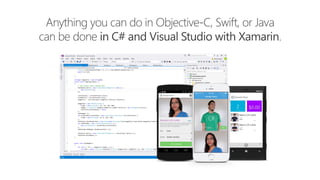 This document discusses Xamarin and cross-platform mobile app development. It highlights that Xamarin allows sharing of C# code across platforms while still providing native UI and full access to APIs. Developers can use C# and Visual Studio to write one codebase that targets iOS, Android and Windows Phone from a single shared codebase. Xamarin compiles to native ARM code for iOS and uses JIT for Android.