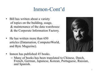William Inmon is considered the father of data warehousing. He has over 35 years of experience in database technology management and data warehouse design. Inmon helped define key characteristics of data warehouses such as being subject oriented, integrated, nonvolatile, and time-variant. He has authored over 45 books and 650 articles on topics related to building, using, and maintaining data warehouses and their role in decision support.
