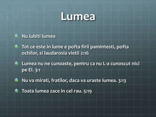 Documentul discută despre natura credinței, iubirii și păcatului în contextul relației cu Dumnezeu prin Isus Hristos. Se subliniază importanța cunoașterii adevărului și a dragostei între credincioși, precum și consecințele urii și necredinței. De asemenea, temele centrale includ viața veșnică oferită prin credința în Fiul lui Dumnezeu și îndatorirea de a trăi în neprihănire.